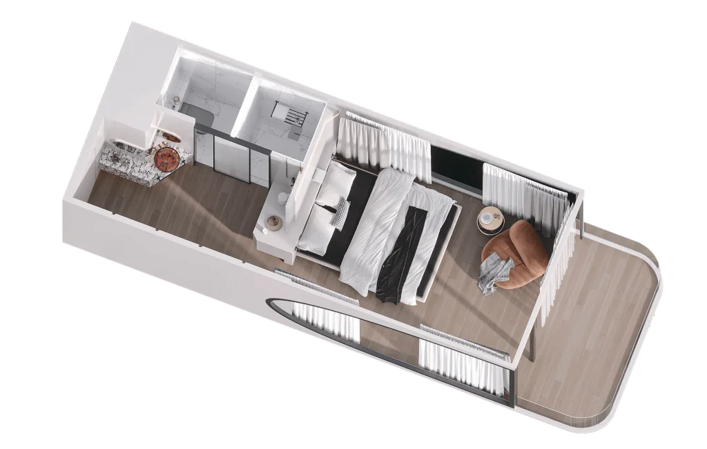 Efficiently combines living space, bedroom, and bathroom with optional kitchenette. Optimized for comfort, convenience, and privacy. Perfect for small households, temporary offices, or short-term housing solutions.